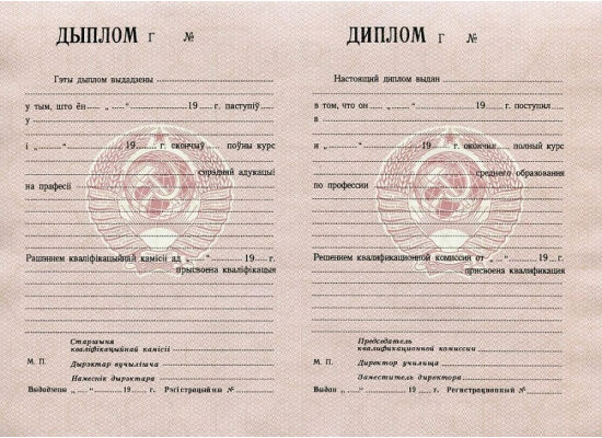 - диплом ПТУ / училища Белоруссии 1970 - 1993 гг. любого года выпуска, включая времена СССР – а дополнительно к нему может прилагаться список предметов и оценок, которые можно выбрать по вашему желанию;
