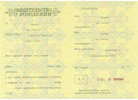 - свидетельство о рождении СССР 1954 - 1970 гг. любого года выпуска, включая времена СССР – а дополнительно к нему может прилагаться список предметов и оценок, которые можно выбрать по вашему желанию;